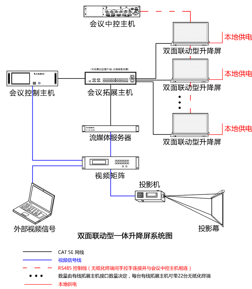 3、系統(tǒng)可以擴(kuò)展第三方網(wǎng)絡(luò)中控,從而實(shí)現(xiàn)任意會議終端(經(jīng)過授權(quán))隨時(shí)對周邊設(shè)備進(jìn)行控制;第三方中控可通過RF/RS 485協(xié)議對升降進(jìn)行統(tǒng)一控制。